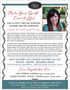I will be traveling to Primitive Gatherings in November for a 2 day machine quilting workshop. November 15th and 16th 2024, I will be teaching at The Gathering Retreat center.