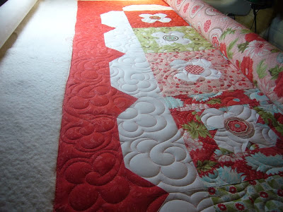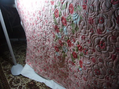 I quilted a pretty flower design, all freehand.  Scott actually picked the design from some of my practice samples.  He really is getting a good eye for all this quilting stuff.