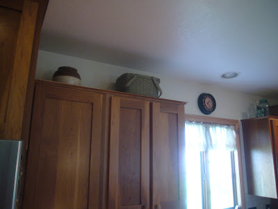 So yes, I am still a little MIA from Blogland.  I just need to concentrate on quilting for a little longer to make some upcoming deadlines, then you should see me a little more….hopefully.  🙂  I thought I would share how I decorated with my goodies that I brought home recently.  While I love primitives, I don’t like a cluttered look.  Nor do I like a “dark” look.  I love antiques.  I would pick an antique over a piece of reproduction furniture that has been painted to look old given the choice.  Not always, but most of the time.  I’ll start with the kitchen.  I wanted to change out my roosters that were above my cabinets.  I was accumulating a few too many and they were looking a little too cutesy for me.