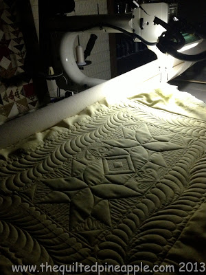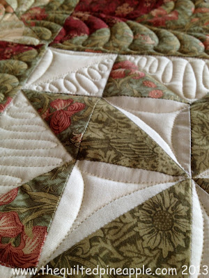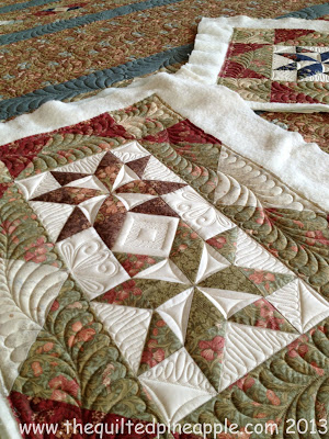 Gorgeous!! I love the romantic feel the fabric gives the quilt! The allover feather was a wonderful complement to it. The outer most border has a feather/swirl combo. I love how it looks!!!