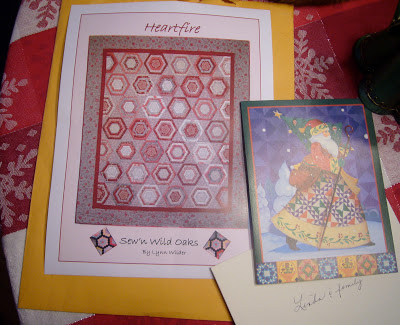 Lynn sent me her own pattern that SHE designed, “Heartfire” and a lovely Christmas card. Lynn is an amazingly talented designer, teacher and quilter! Her blog is Sew’n Wild Oaks Quilting Blog. It’s such an AWESOME blog. Lynn is always posting beautiful quilting pics, tutorials and the most delicious recipes! I just told her I’ve probably gained 5 pounds since I started reading her blog! If you’ve never been to her blog, stop by and say “hi” and check out all her wonderful posts. I mentioned to Lynn a while ago that I just loved her “Heartfire” pattern and wanted to purchase it, so look what landed on my doorstep! I think I already have the fabric picked out to make it! This project will be moved high on my priority list in the new year. I can’t wait to get the fabric to start it!