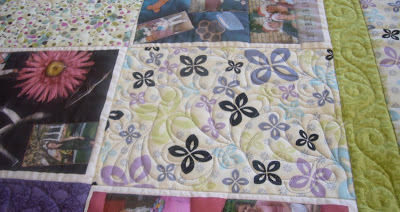 The back. This quilt took me longer than I expected it would because of the amount of stitch in the ditch and ruler work involved going around the photos. Newbie mistake.