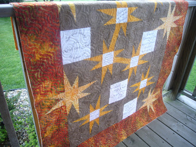 In between quilting custom quilts, I try to always quilt a few allover type quilts. It is a nice break from the concentration it requires to get a custom quilt done. I love the creativity in custom quilting, but it can be mentally and physically exhausting. Doing a few allovers before starting my next custom job really helps to re-motivate and re-energize me. I had the pleasure to quilt a very inspirational quilt for Pam. She was gifting it to someone who had lost a loved one far too soon.