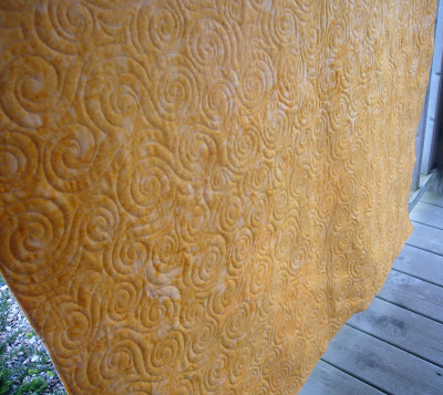 Pam did a wonderful job on the piecing with all those points! The fabric is beautiful. I love how it turned out. The quilting added texture and movement without taking away from the quilt. A simple allover swirl fit the bill for the quilting. The thread is Vegas Gold from Glide, top and bobbin. Batting is Quilters Dream Cotton in the mid loft.