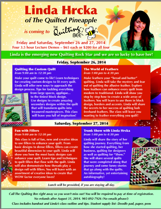 I have a big, exciting announcement!!!!  I am going to be teaching at The Quilting Bee located in Fonthill, Ontario Canada!!  2 days of “filled to the brim” workshops on September 26 and 27 2014.  I am thrilled beyond words for this opportunity to share my knowledge with fellow quilters!!  The Quilting Bee is a wonderful quilt shop, as well as an Innova Longarm Dealer located in Ontario, Canada.