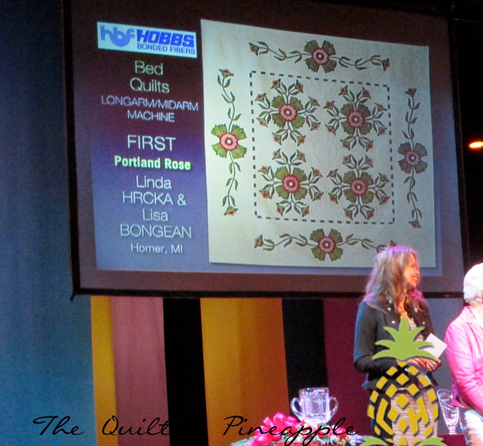 PORTLAND ROSE WON FIRST PLACE in the bed quilts Longarm/midarm category!!!!!!  I never heard mine and Lisa’s names called because we were screaming sooooo loud!!!  Shock, surprise and crying all in one as I walked on stage to receive the “Oscar”!!