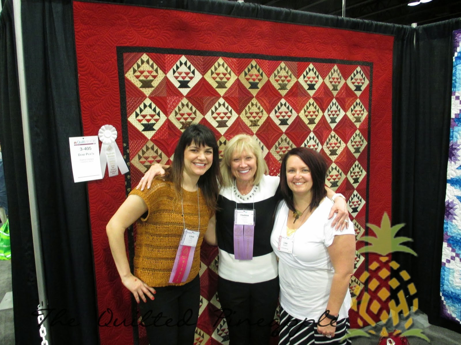Boy, do I have a story for you all!!!  Oh where to start???  I am so excited and can barely sit still long enough to write this post.  I will try not to be too wordy.  πŸ™‚  I will try to start from the beginning. πŸ™‚ Last week was Quilt Week at AQS Paducah.  I made the last minute decision last month to attend the show.  I have never been, but this year turned out to be extra special.  I submitted the quilt, Portland Rose on behalf of Lisa Bongean and myself and it was accepted.  In addition, my friend Thelma also submitted her quilt, Done Pick’n, (pattern Door County Cherry Baskets by Lisa Bongean), which I quilted AND it was accepted!!  I thought “what are the chances I will ever have TWO quilts that I quilted in Paducah at the same time ever again??”  So I made the decision to make the 8 hour drive to attend the show for the experience of it all. I mean doesn’t every quilter have Paducah on their Bucket List??