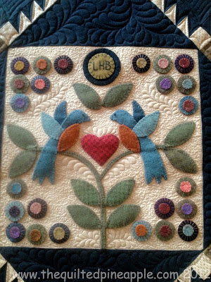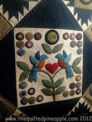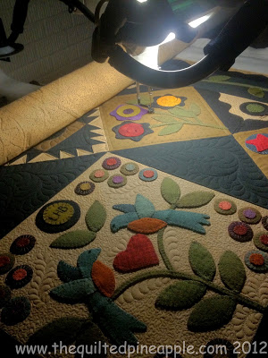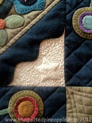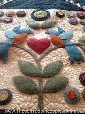 Specifics…Dream Blend batting, So Fine threads top and bobbin…4 of them. All quilting is freehand. I used my straight ruler and little curved cross hatch ruler. I DID stitch on the wool where needed. It really helps the wool applique pop.