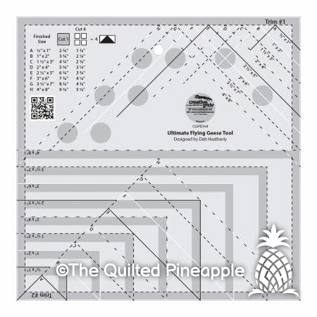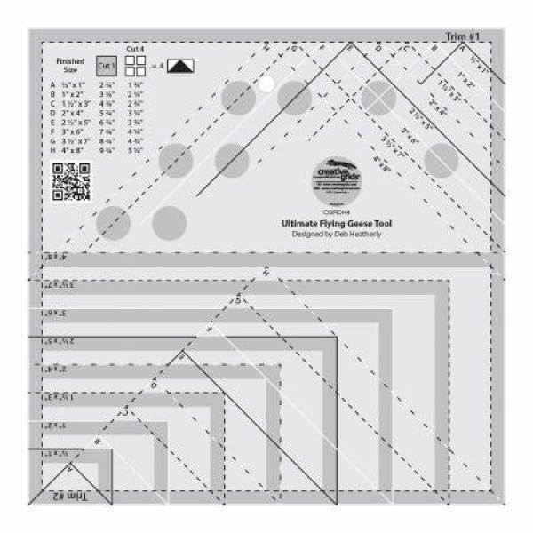 Very fast, easy and accurate! Make four Flying Geese units at one time – the printed cutting chart on the ruler works for TWO different methods! Or, oversize your favorite method for making Flying Geese, then use the Ultimate Flying Geese Tool to trim to perfection. Create eight different finished sizes from 1 x 2 to 4 x 8 inches – the cutting requirements for each size is printed right on the tool! Or, use your favorite method to create over-sized units… then trim them down to perfection.