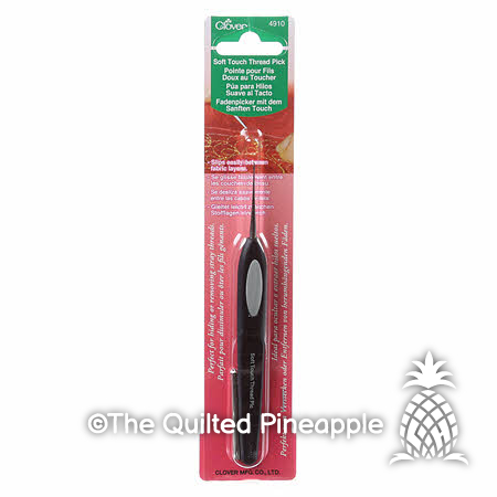 The soft touch thread pic hides broken threads. Pull threads to the inside of the project, never to be seen again! Remove unwanted stray threads caught between the top and batting. Correct mistakes in corners. Use to hold your project in place while stitching. Push edges for quick turn applique projects. In surging, use to hide serger tails in the seam. Easily repair snags in sweaters and knitted items. By Clover.